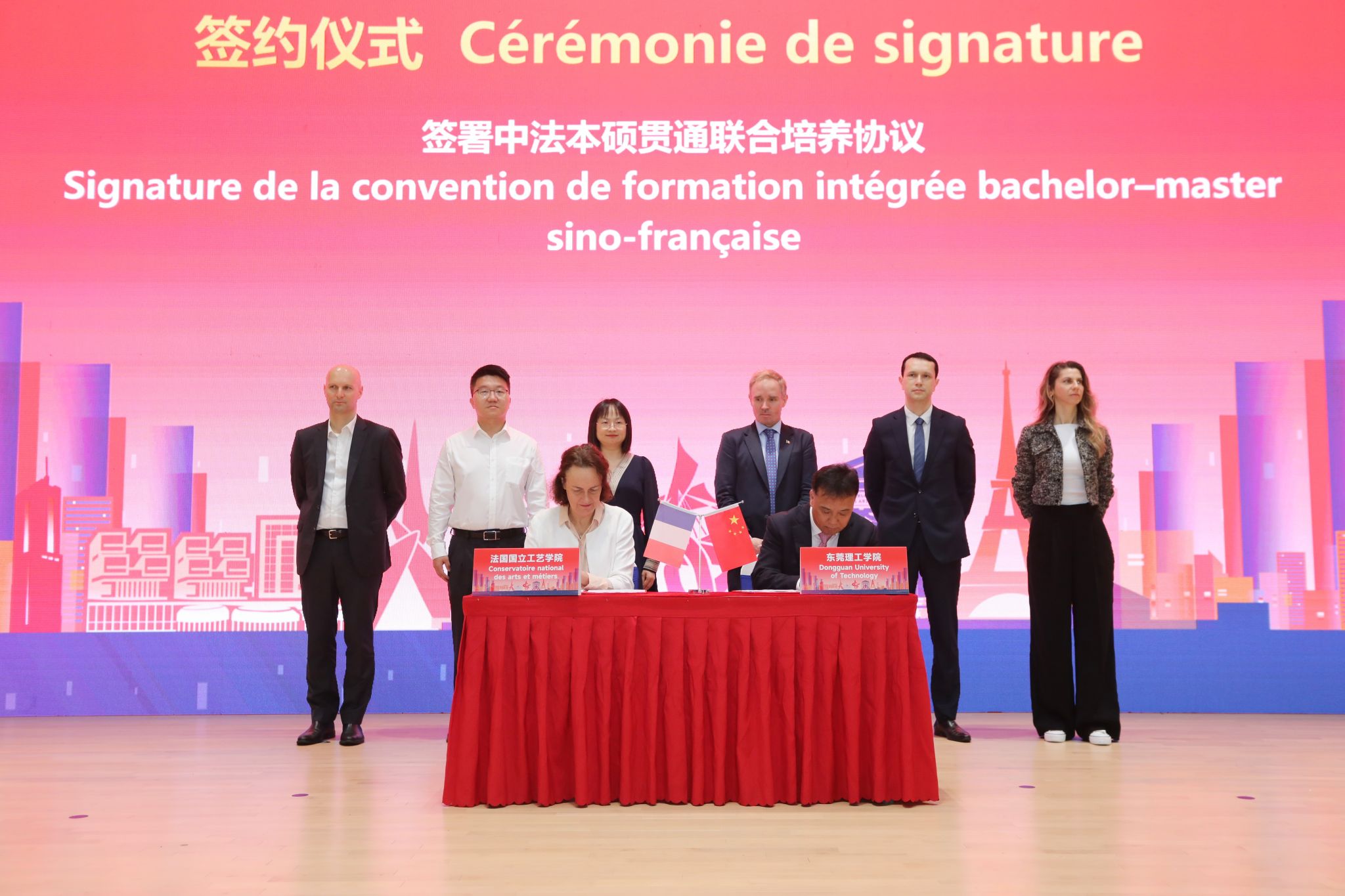 3月30日上午,东莞理工学院中法工程人才培养国际合作与校企协同发展大会在学校国际合作创新区举行。现场,东莞理工学院与法国国立工艺学院签署了东莞理工学院法国国立工艺学院联合学院(以下简称为“中法学院”)本硕贯通联合培养协议,中法学院与7家行业领军企业签署校企协同育人与工程人才实训基地合作协议。