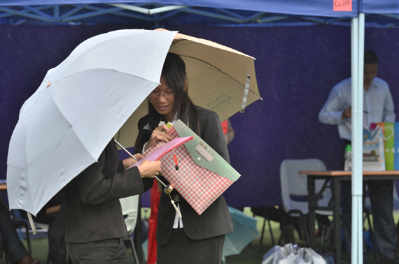 毕业生在雨中分享应聘经验