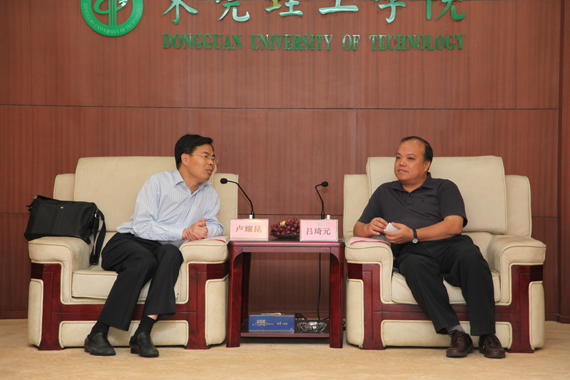 座谈会上,吕琦元对卢耀昆一行来我校调研表示热烈欢迎。他向调研组介绍了学校的发展概况和发展新战略,表示服务东莞是我校作为子弟高校的重要职责。卢耀昆介绍了“加强基层干部能力建设、加强机关干部基层历练”课题调研的背景和内容。随后,双方围绕主题,从不同角度进行了探讨和交流。我校参加座谈的教师结合各自所学专业和研究情况对“双基建设”的重要性、方法、途径等问题谈了自己的看法。