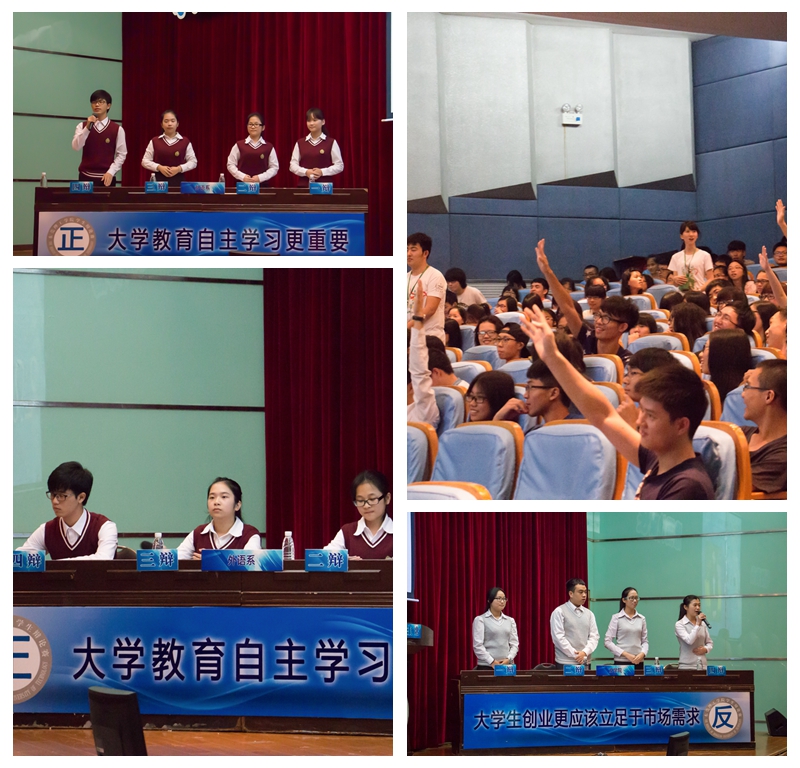 来自政法学院和文学院的冠军争霸赛更是将辩论赛推向了高潮。正方政法学院的一辩从大学生立足自身优势的三大特性为切入点,用通俗幽默的语言陈述己方“大学生创业更应该立足于自身优势”的观点。反方文学院则从市场经济规律出发,进行层层剖析,论证“大学生创业更应该立足于市场需求”的观点。在随后的攻辩环节中,双方更是争锋相对、步步紧逼,现场气氛迅速升温,达到白热化阶段。在自由辩论环节。正方以当前大学生创新与热情为例,指出了大学生能够凭借新颖的创新灵感在市场中打出一片新天地的论点,辩手们精辟的措辞,犀利的言辞,展现出咄咄逼人的气势。反方辩手也毫不示弱,他们通过阿里巴巴与网易等公司的发展,多角度地论证了己方观点。