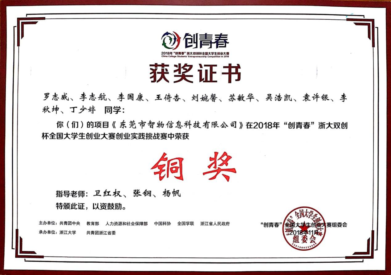 近日,2018年“创青春”浙大双创杯全国大学生创业大赛终审决赛在浙江大学举行。在本届大赛中,我校学子再续佳绩,学生创业团队的项目《东莞市智物信息科技有限公司》(主要参加者:罗志威、李志航、李国康、王倚杏、刘婉馨、苏敏华、吴浩凯、袁许银、李秋坤、丁少婷,指导老师:卫红权、张钢、杨帆)、《善馀文化培育中心——文化遗产保育与拓展项目》(主要参加者:黎玉婷、邝韵婷、邹明静、郑晓婷、钟泳欣、周洁婷、王冠军、刘庆新、曾协鹏、李炯霞,指导老师:张颖君、陈柏福、袁艺峰)分别在创业实践挑战赛和公益创业赛中荣获铜奖。