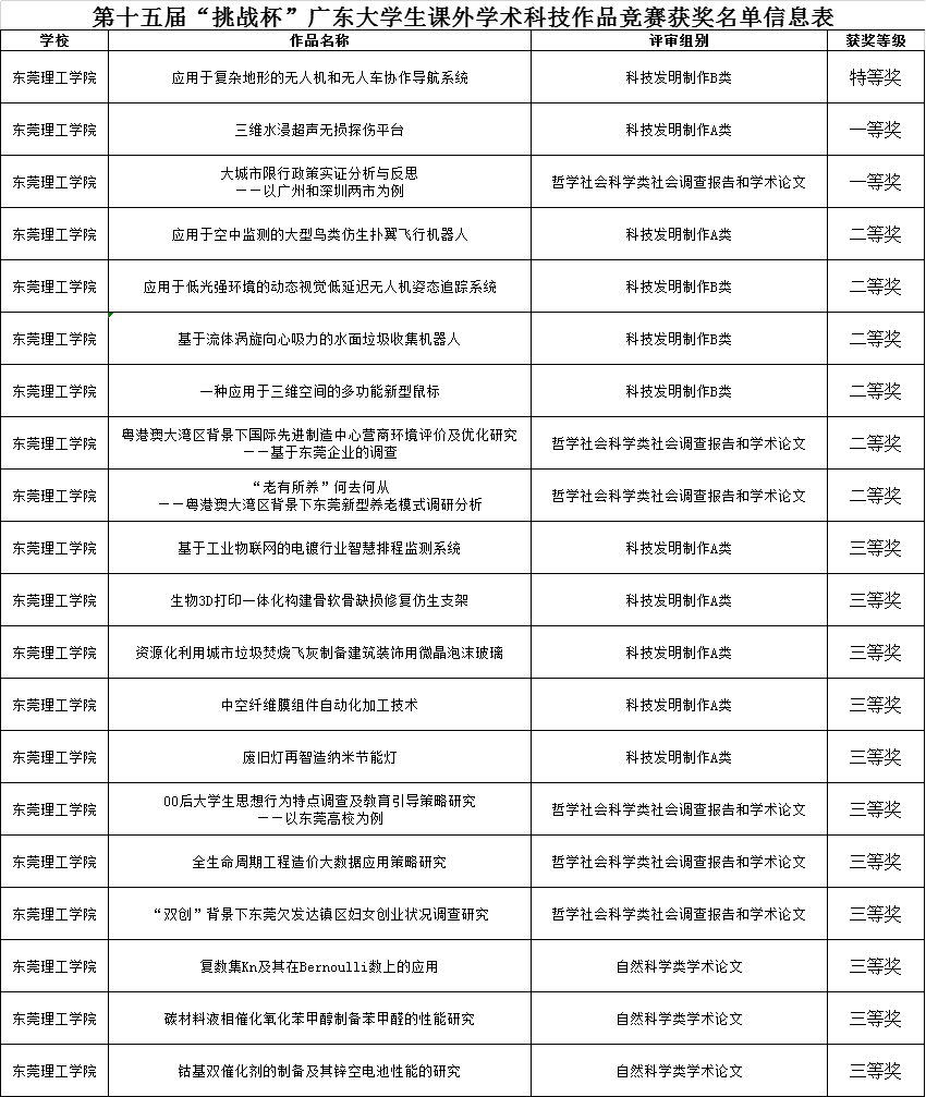 525至26第十五届“挑战杯”广东大学生课外学术科技作品竞赛终审决赛于佛山科技学院仙溪校区举行,来自全省各高校的751件作品同场竞技,共同展示学术科技之魅力。本次终审决赛中,我校表现优异,首次捧得“优胜杯”,实现新的突破。项目“应用于复杂地形的无人机和无人车协作导航系统”荣获科技发明制作B类机械与控制组特等奖。另外,还有2个项目团队获得一等奖、6个项目团队获二等奖以及11个项目团队获得三等奖。