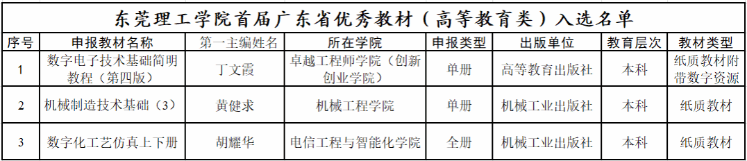近日,广东省教育厅公布了首届广东省优秀教材(高等教育类)名单(粤教高函〔2025〕18号),我校限额申报的6本教材中共有3本入选。