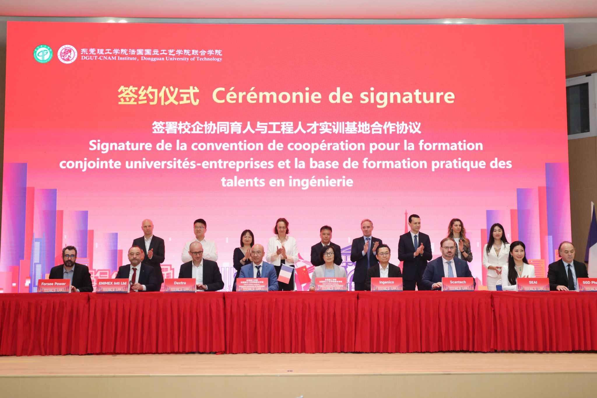 3月30日上午,东莞理工学院中法工程人才培养国际合作与校企协同发展大会在学校国际合作创新区举行。现场,东莞理工学院与法国国立工艺学院签署了东莞理工学院法国国立工艺学院联合学院(以下简称为“中法学院”)本硕贯通联合培养协议,中法学院与7家行业领军企业签署校企协同育人与工程人才实训基地合作协议。