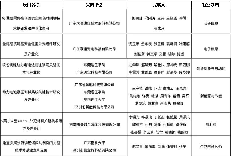 记者梳理发现,13个获奖项目的单位包括生益电子股份有限公司、广东生益科技股份有限公司、东莞市德普特电子有限公司、东莞理工学院、散裂中子源中心、中国科学院高能物理研究所、东莞宜安科技股份有限公司、松山湖材料实验室、中科晶益(东莞)材料科技有限责任公司、广东大普通信技术股份有限公司、广东亨通光电科技有限公司、广东恒翼能科技有限公司、广东医科大学等企业、科研机构、高校。