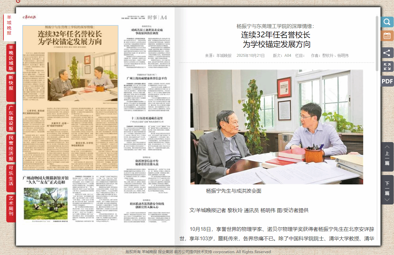 “我与东莞理工学院的关系,在国内和国外都是唯一的。”2018年5月,杨振宁曾言。广东省科协党组书记、专职副主席成洪波在接受记者采访时难掩哀思,他结合担任东莞理工学院党委书记期间,与作为名誉校长的杨振宁先生十余年的交往经历,深情追忆了这位世纪学者对广东地方教育的深情托举,感叹杨振宁先生就是一位睿智、仁爱、率真的大先生。成洪波谈到,杨振宁始终亲力亲为关注着东莞理工学院的发展——小到年度工作细节的邮件回复,大到战略定位、人才培养与教师队伍建设的方向指引,无不倾注心血。