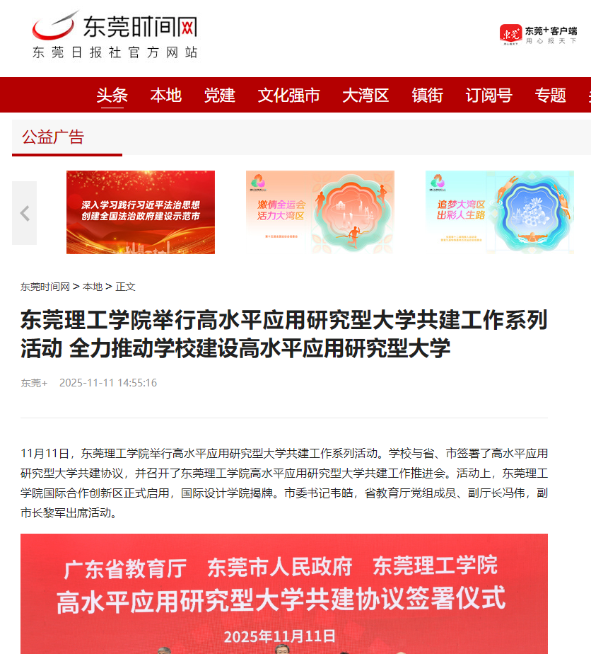 11月11日,东莞理工学院举行高水平应用研究型大学共建工作系列活动。学校与省、市签署了高水平应用研究型大学共建协议,并召开了东莞理工学院高水平应用研究型大学共建工作推进会。活动上,东莞理工学院国际合作创新区正式启用,国际设计学院揭牌。市委书记韦皓,省教育厅党组成员、副厅长冯伟,副市长黎军出席活动。