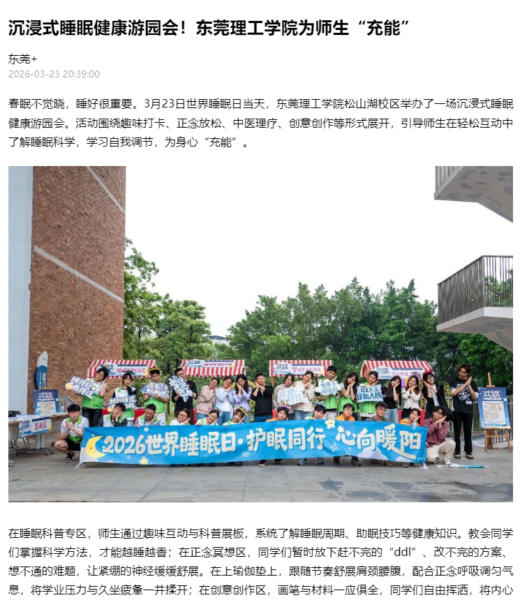 春眠不觉晓,睡好很重要。3月23日世界睡眠日当天,东莞理工学院松山湖校区举办了一场沉浸式睡眠健康游园会。活动围绕趣味打卡、正念放松、中医理疗、创意创作等形式展开,引导师生在轻松互动中了解睡眠科学,学习自我调节,为身心“充能”。