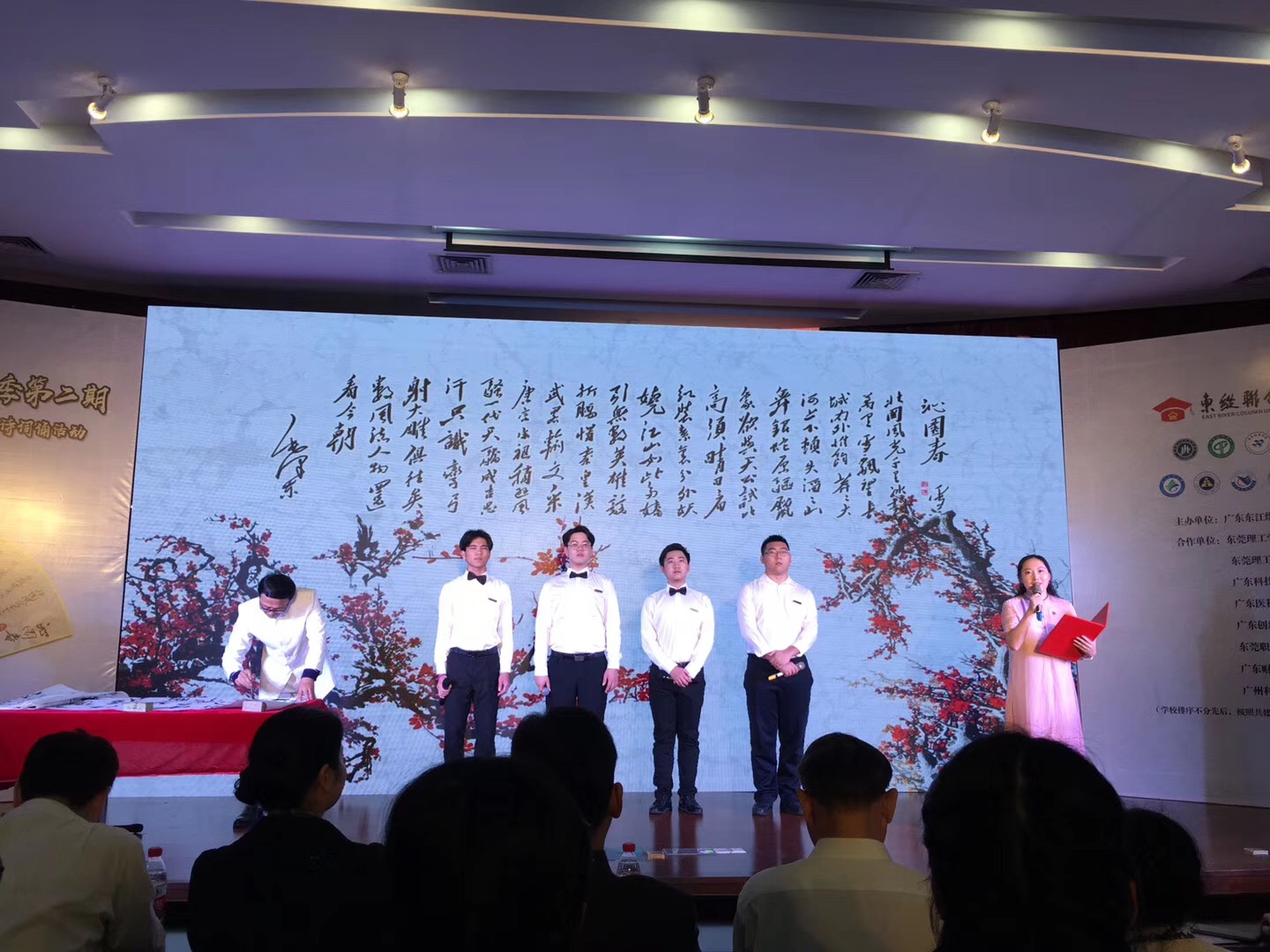 教育学院杨万江和王凌卿老师带领4名学生也在本次诵咏活动中奉献了精彩的演出,他们通过老师朗诵、学生朗诵、旁白介绍以及现场挥毫书法展示等多种形式展示了毛泽东诗词《沁园春·雪》的大气与磅礴。