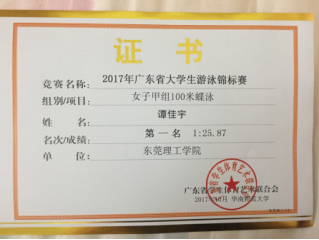 赛后统计,本届广东省大学生游泳锦标赛中,东莞理工学院游泳队共获得1项第一名、4项第二名、4项第三名、1项第四名、2项第六名,并获得甲组女子团体总积分第六名。