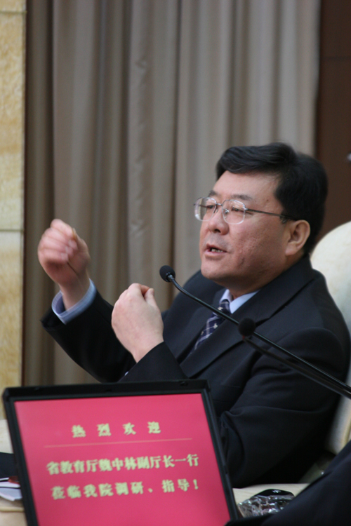 在听取完杨晓西有关学院发展现况及发展设想的介绍后,魏中林高度赞扬了我院近年来的建设发展成就,他说,东莞理工学院的专业学科设置科学合理,充分考虑到地方经济社会发展的需要与自身发展的实际,在对外开放办学、学生培养等方面的工作也有特色。他同时也强调,学院已注意到了办学质量这一热点重点问题,但在下来的工作中,要加强学习领会落实教育部的相关文件精神,强化办学质量意识,培养出更多具有创新精神和创新能力的人才。