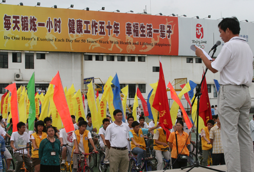 在激情洋溢的音乐声中,插着锦旗的自行车队浩浩荡荡地向松山湖出发了。他们脸带微笑,活力招展,展现了当代大学生热爱运动,挥洒青春的激情。