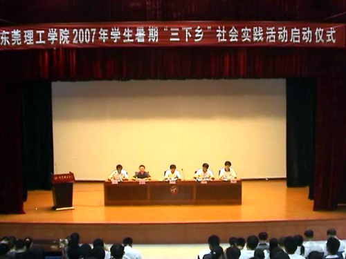 7月12日下午,东莞理工学院2007年学生暑期“三下乡”社会实践活动启动仪式在学生活动中心小剧场举行。院党委副书记王江水,院党委宣传部部长李培经,院学生处副处长邢大立,院学生处副处长兼团委书记彭晓波以及各系(院)主管学生工作领导、辅导员,实践分队指导老师和负责人,部分班级学生代表参加了仪式。