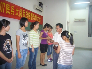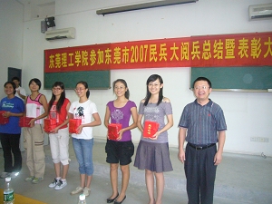 9月19日下午,在教学楼6B101召开了东莞理工学院参加东莞市2007大阅兵总结暨表彰大会,对我院在东莞市民兵阅兵活动暨国家教育训练基地启用仪式上表现突出的女民兵进行表彰奖励。 学院党委副书记王江水、副院长戴炳源,学生处处长邢大立出席了此次表彰大会并为获奖者颁奖。 会上,戴炳源充分肯定了我院女兵方队在阅兵活动中的表现,对我院女民兵的精彩演出得到了各级领导的称许表示祝贺。王江水在总结发言中指出,希望女兵们能将那种艰苦拼搏精神发扬开来,把这种精神带到今后的学习、生活、工作中去。
