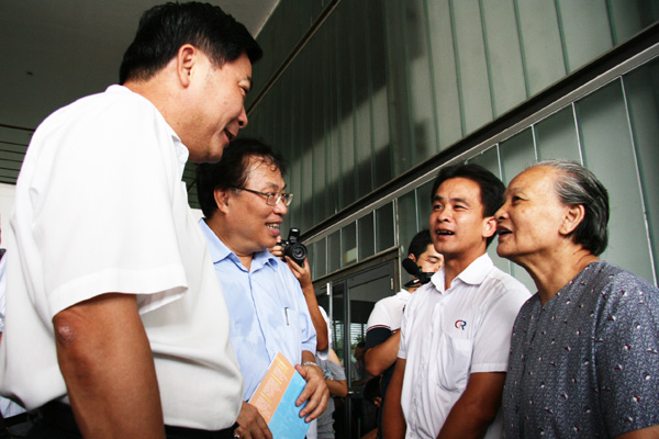学校领导一早开始视察学院各项“迎新”工作,图为校党委书记周致纳和校长杨晓西询问新生家长报到情况