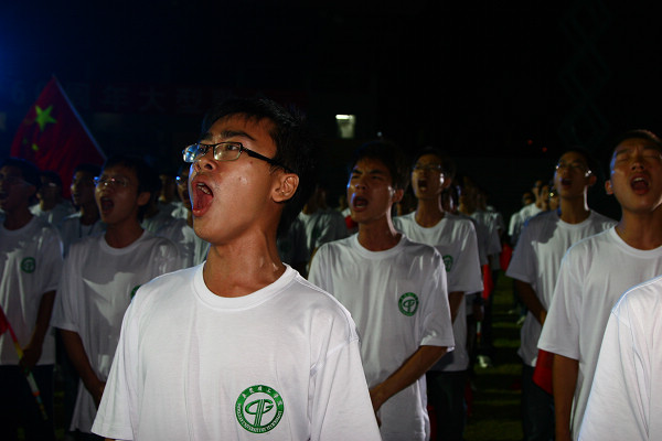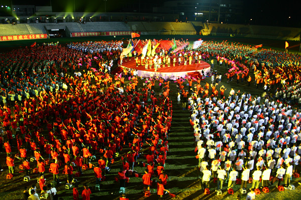 昨晚,学校庆祝中华人民共和国成立60周年系列活动的重头戏之一——《祝福祖国》大型歌会在主田径场进行了彩排,由12个院系3000多名同学组成的12个方阵,在田径场中央摆出了巨大的圆形,耳熟能详的红歌,在圆形方阵中此起彼伏,全场红旗飘飘,同学们热情高涨,用嘹亮的歌声“祝福祖国”,场面震撼,让人不由地热血沸腾。一位参与演出的新同学说:“太振奋人心了!一来学校就能参与这么大型的演出,我很自豪,能以这种方式祝福新中国六十华诞,我很庆幸,我们全系上下都准备好了,我们很期待正式的演出。”一位歌会编导组的成员说:“今天晚上的彩排达到了预期的效果,正式演出时加上看台上7000多名观众的互动,达到万人同唱红歌的场面,绝对能让人激发出无限的爱国热情。”当晚,周书记、杨校长也来到了演出现场彩排他们即将演唱的曲目,让演出方队的同学们备受鼓舞。