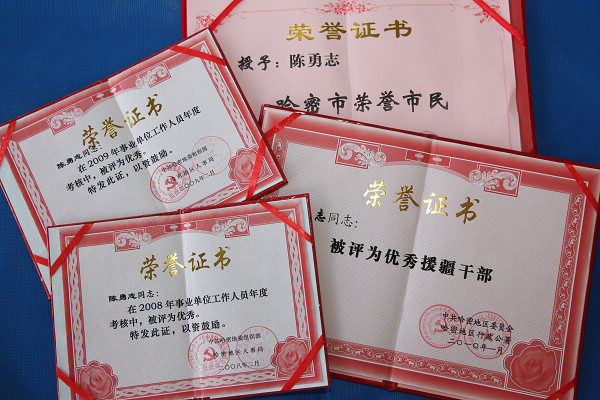 在这次工作中,陈勇志取得了优异的成绩,被中共哈密地区委员会、哈密地区行政公署评为“优秀援疆干部”,连续两度在哈密地区事业单位工作人员年度考核中被评为“优秀”;还被礼聘为“哈密市荣誉市民”。(文/叶海青 陈运银)