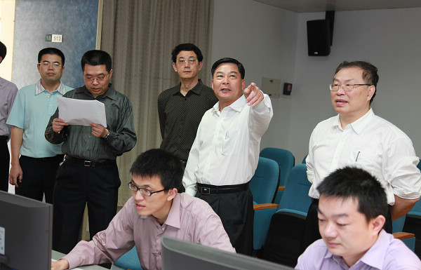 在检查完课堂教学后,周致纳、杨晓西等到设在行政楼五楼的教学观摩中心检查,并先后调看了多间课室的课堂教学视频信息。