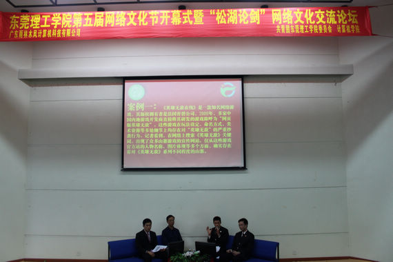 校团委书记、学生处副处长彭晓波启动Flash,标志着第五届网络文化节正式拉开帷幕。随后,进行了“松湖论剑”网络文化交流论坛。本次论坛的嘉宾有我校计算机学院徐钦贵副教授,东莞市第一市区人民检察院余和杰和金世刚两位检察官。论坛主要围绕“网络‘山寨’”,“网络不正当发帖”和“人肉搜索”这三个话题来展开交流。嘉宾们通过一个个案例讲述了自己的见解,也让在场的同学了解到更多关于网络与法律的关系。