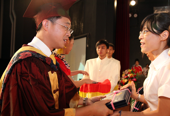 6月26日,我校在大礼堂举行2012届学生毕业典礼,欢送3213名应届毕业生。学校党委书记成洪波向毕业生代表颁发毕业证书;校长杨晓西为获得学士学位的毕业生代表扶正流苏,并致辞。
