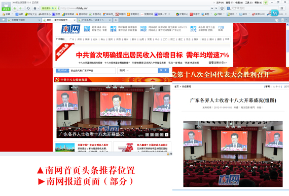 今日上午,我校集中收看电视直播的照片被南方报业集团官方网站南网采用,并在头条推荐的位置滚动推荐(报道标题为广东各界人士收看十八大开幕盛况(组图),网址链接为