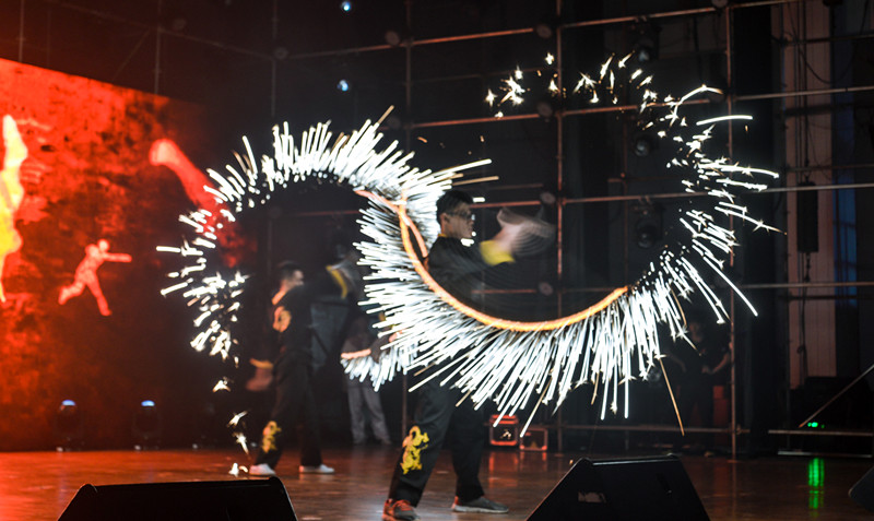 军训团文艺连带来的乐队演唱《黄种人》结合东西方乐器,TNT街舞协会动感韵律的《歌舞青春》率先引爆全场。情景剧《戒网情深》令人捧腹大笑的同时,启人思考;武术《尚武》尽显莞工学生的健康体魄与力量感;歌曲《晚风吹过哨塔》《草原赞歌》,婉约柔和的音乐风格与YMCA街舞协会活跃律动的舞蹈互相配合,将晚会推至高潮。