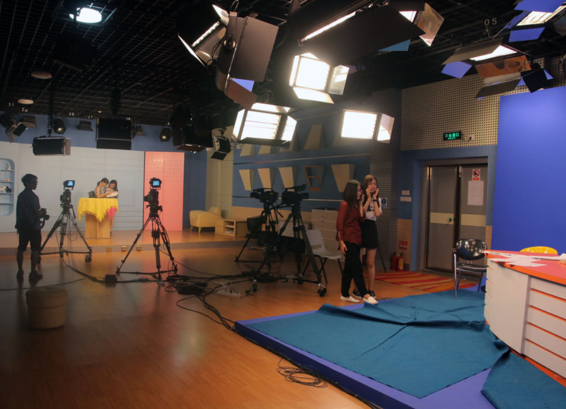 应届考生参观文学院的演播厅