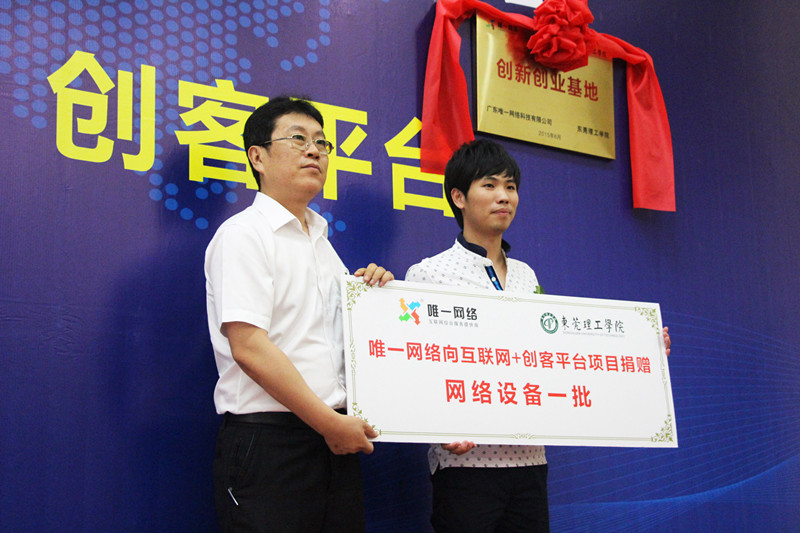6月18日,唯一网络携手我校打造“创新创业合作基地”揭牌仪式在我校松山湖校区图书馆报告厅举行。校党委副书记吕琦元与广东唯一网络有限公司董事长王宇杰为基地揭牌。