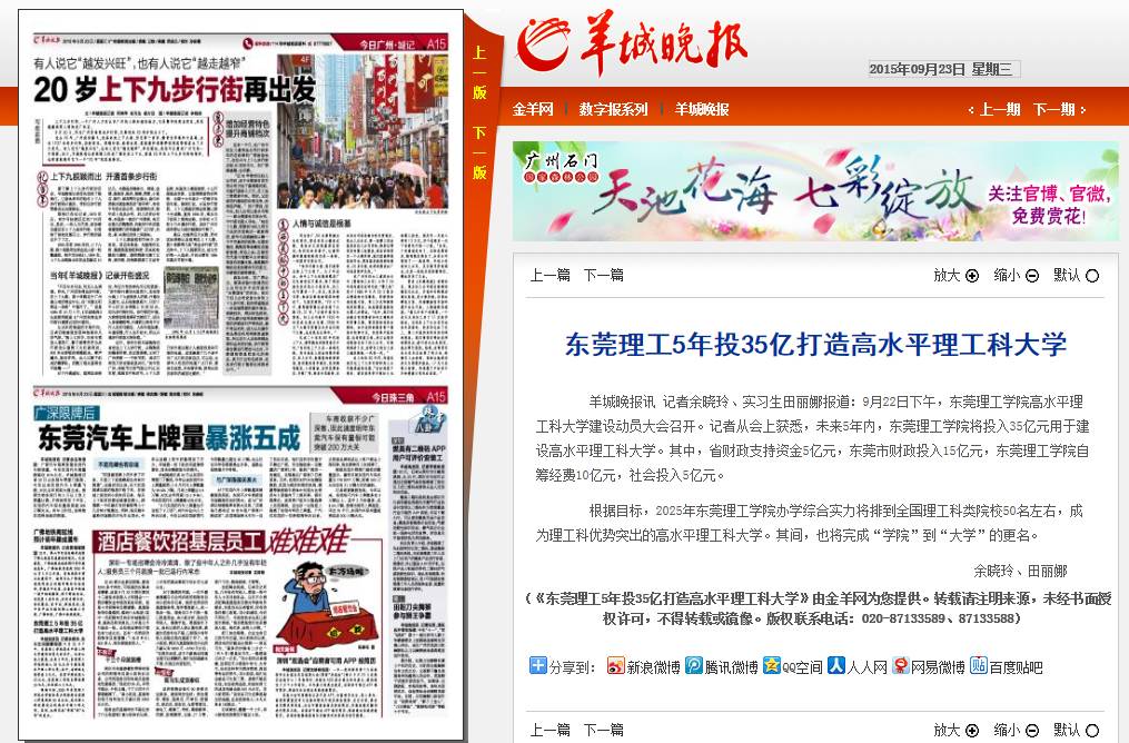 (6)《羊城晚报》主报A15版刊登《东莞理工5年投35亿打造高水平理工科大学》