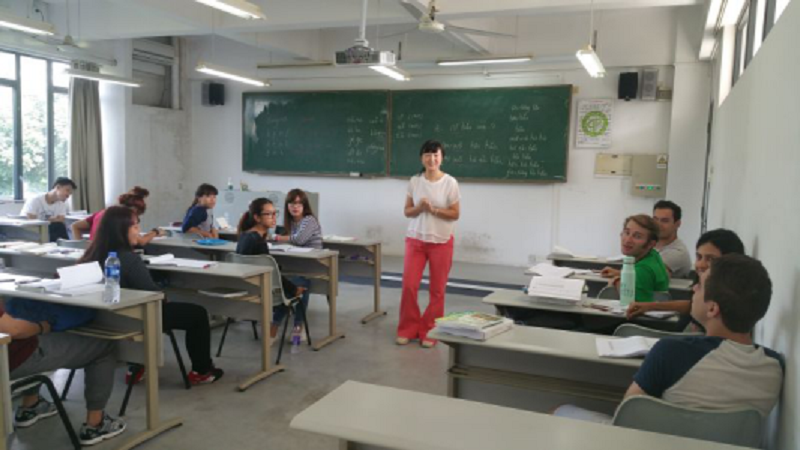 在6A-302教室里,国际学院首批入学的外国留学生开始了他们入学后的第一节汉语课。孙莉明老师向留学生介绍了中国人见面时使用的问候语和常用生存汉语。随后,孙莉明老师通过示范发音、词意讲解、情景展示、互动交流等多种方式开展教学,留学生们很快地掌握了汉语常用问候语。课堂上,灵活多变的教学方法,生动有趣的教学风格,让留学生们在轻松、愉快的氛围中掌握汉语入门知识,领略汉语和中华文化之美。