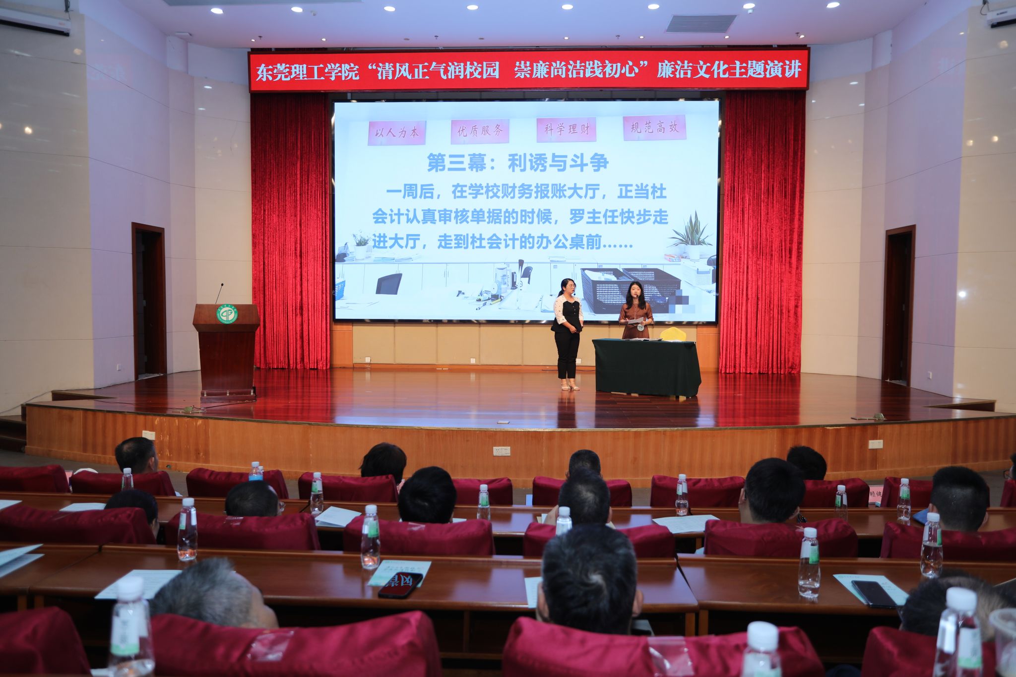在国庆、中秋“双节”来临之际,东莞理工学院师生共同上了一堂生动特别的廉洁教育课。9月28日下午,东莞理工学院“清风正气润校园 崇廉尚洁践初心”师生廉洁文化主题演讲活动在松山湖校区学术会议中心举行。来自各二级组织机构的师生代表登上舞台,通过演讲、情景剧等方式宣讲廉洁文化,弘扬清风正气。东莞市教育局、东莞职业技术学院相关负责人以及学校领导、师生代表等400多人参加活动。