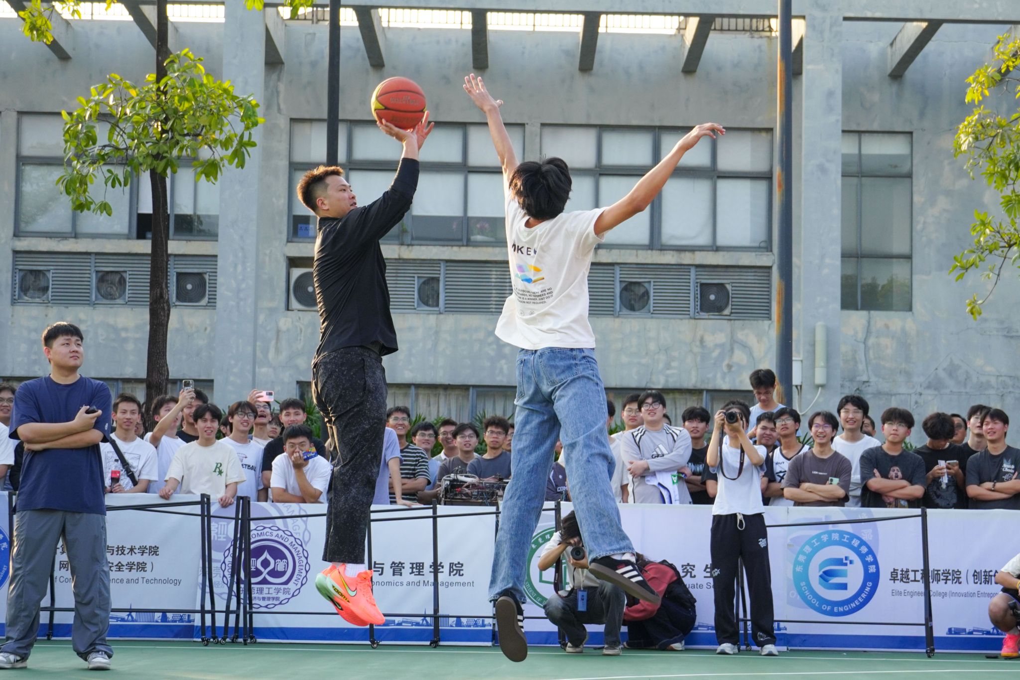 为提升赛事专业度与影响力,2025 年莞工 UBA 深化多方合作,实现品牌能级新突破。赛事组委会特邀前国家男篮队员孟铎与知名篮球博主马超同台助阵篮球嘉年华,以篮球为媒介,让莞工球迷近距离互动感受职业篮球的拼搏精神与专业素养。此外,赛事组委会发挥校友力量,邀请2025年全运会男子篮球联赛官方MC、学校2016届何民许校友返校带来专业解说,继而打造火热赛场。同时,赛事延续与陆逊梯卡华宏(东莞)眼镜有限公司的深度合作,社会力量的加入为赛事的专业举办提供了坚实保障。