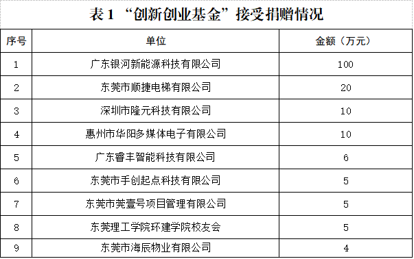 12月18日,东莞理工学院创新创业基金正式成立。基金目前已获得广东银河新能源科技有限公司、东莞市顺捷电梯有限公司等9家企业共计165万元现金捐赠。