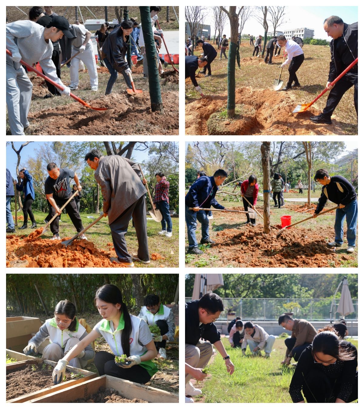 在国际合作创新区和守正园,师生分工协作,一片火热的劳作场景。众人扶正苗身、挥锹培土,再踩实、浇水,春天的气息和劳动的欢愉交织,现场笑语不断。