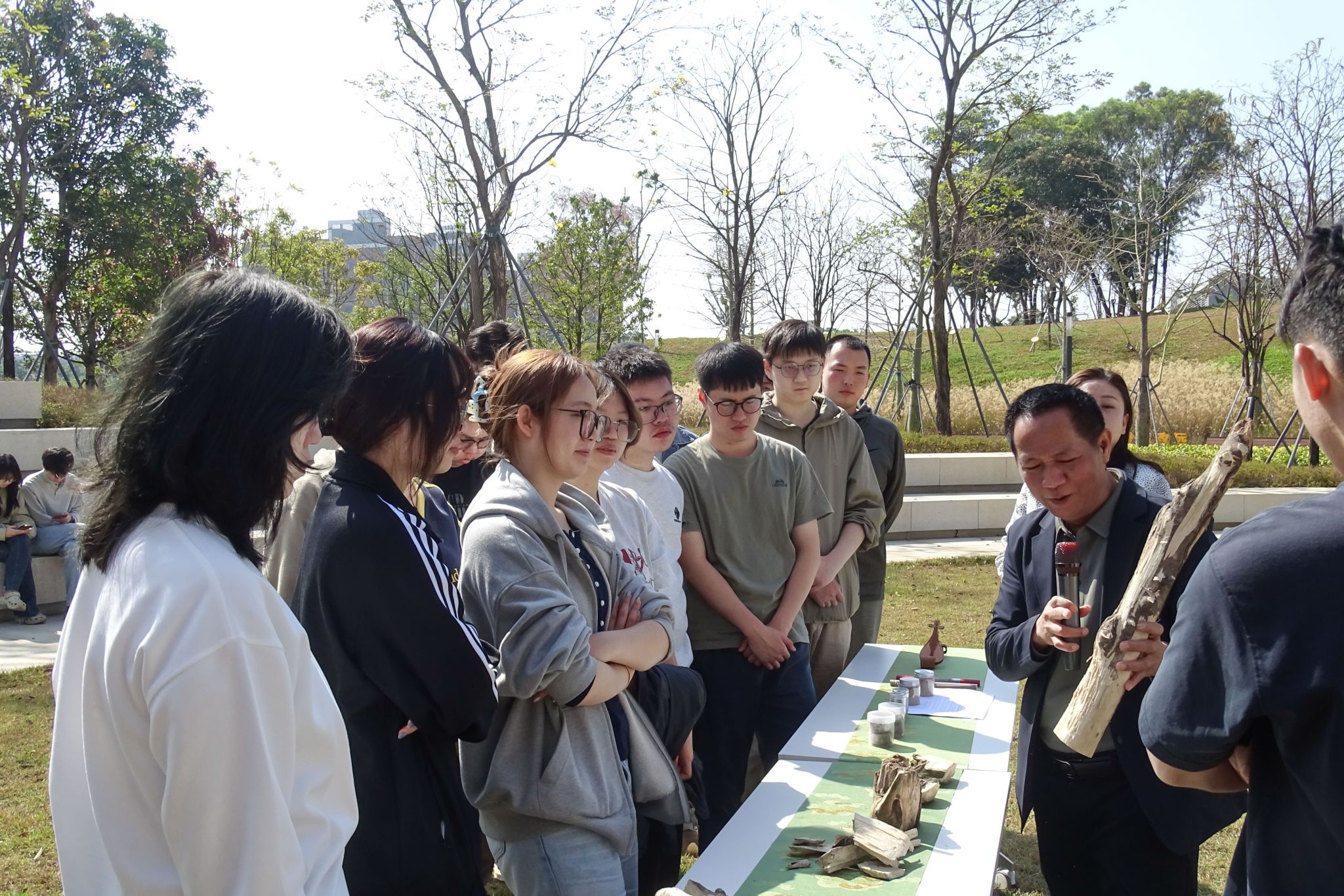 在植树节当天,一堂“绿美生态实践课堂”走进国际合作创新区。广东省非物质文化遗产“莞香制作技艺”代表性传承人汤锦华来校,为同学们介绍莞香文化。汤锦华围绕莞香的历史渊源、种植技艺与文化价值开展分享。在场同学认真聆听,对莞香及莞香文化有了更深刻的认识。
