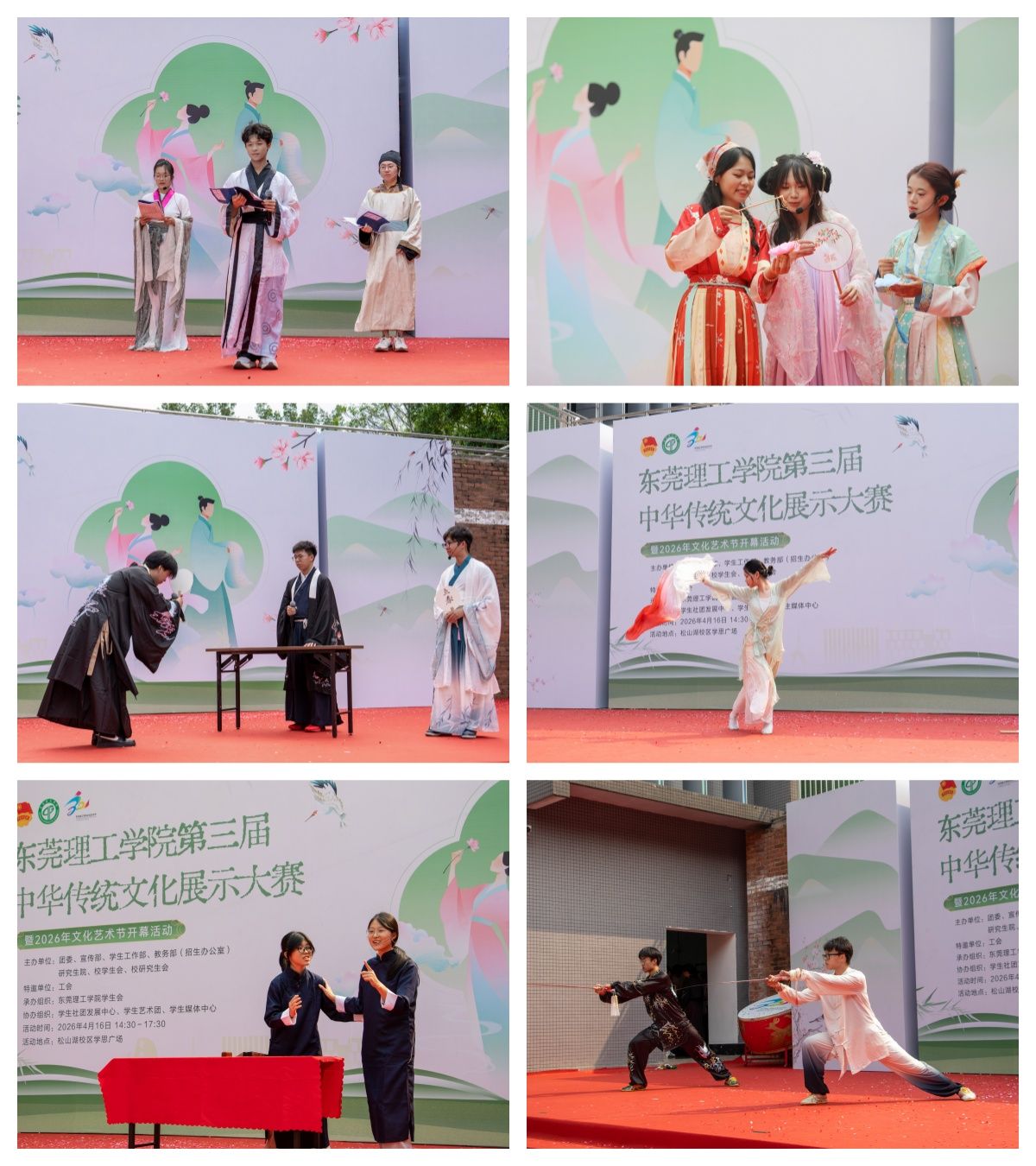 中华传统文化展示大赛上,各二级学院围绕16个传统文化主题,立足学科专业特色,结合学生兴趣特长,精心编排、认真打磨,共同呈现了一场既有新意又有心意的文化盛宴。百余名莞工学子轮番登台献艺,声乐、舞蹈、朗诵、戏剧、武术等节目接连上演,让现场群众在文化视听盛宴中感受传统文化与青春活力的碰撞。