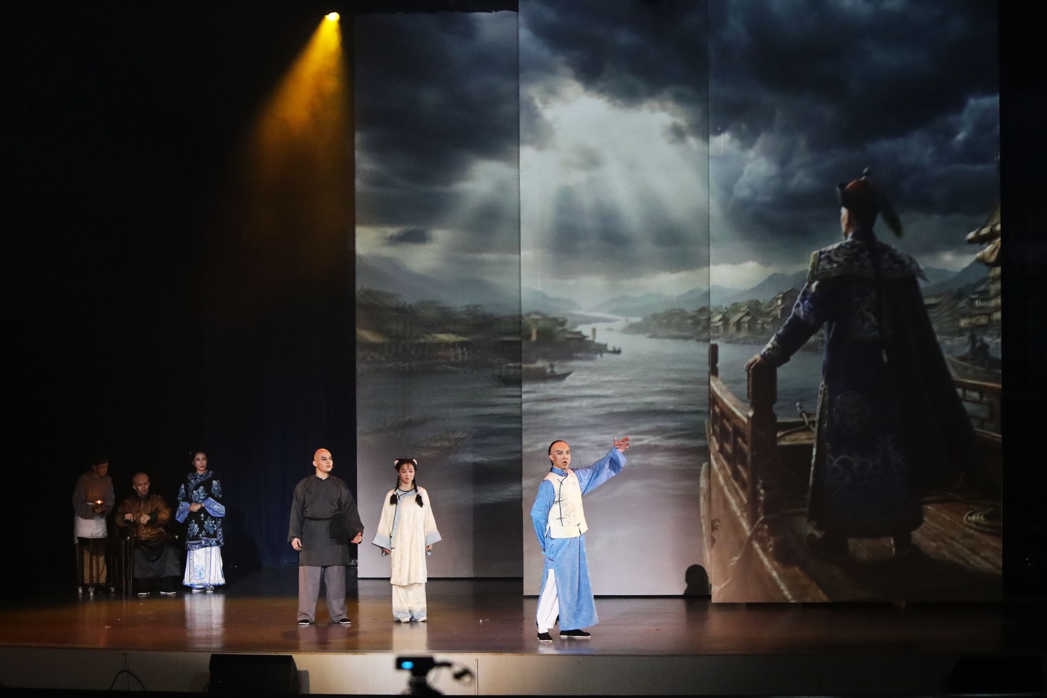 聚光灯刺破黑暗,牙香街的牌坊在舞台上缓缓亮起,牙香街商民泣血写下严惩烟贩的请愿书,鼓声隆隆,传递着众人心中的愤怒与不屈……