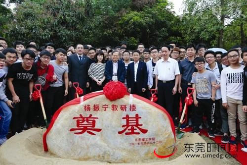 22日上午9时30分,在莞工松山湖校区图书馆旁边的一块草地上,成洪波、李琳等莞工领导与100多名学生早早来到这里,等候名誉校长杨振宁的到来。在现场举行的杨振宁教研楼奠基仪式上,杨振宁伉俪和出席活动的莞工校领导共同为教研楼培土。
