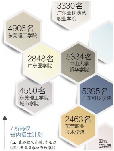 对于多校区办学的两所高校来说,东莞已经成为其办学的“大本营”。其中,广东医学院计划在省内招收2848名新生,除了临床医学、麻醉学和医学影像学等三个专业的592名新生之外,其他专业和新生均安置在东莞校区。中山大学新华学院计划招收5334名新生,其中东莞校区将安置4305名新生。