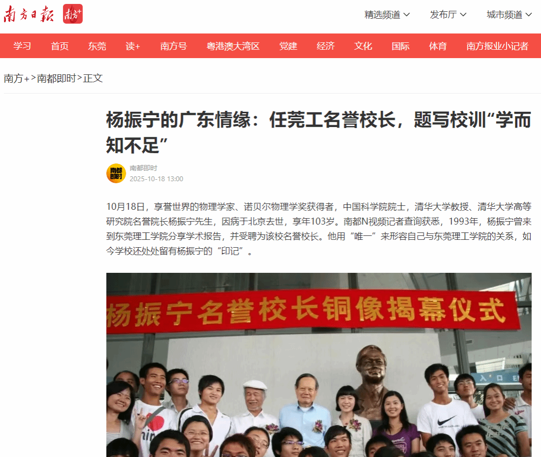 10月18日,享誉世界的物理学家、诺贝尔物理学奖获得者,中国科学院院士,清华大学教授、清华大学高等研究院名誉院长杨振宁先生,因病于北京去世,享年103岁。南都N视频记者查询获悉,1993年,杨振宁曾来到东莞理工学院分享学术报告,并受聘为该校名誉校长。他用“唯一”来形容自己与东莞理工学院的关系,如今学校还处处留有杨振宁的“印记”。