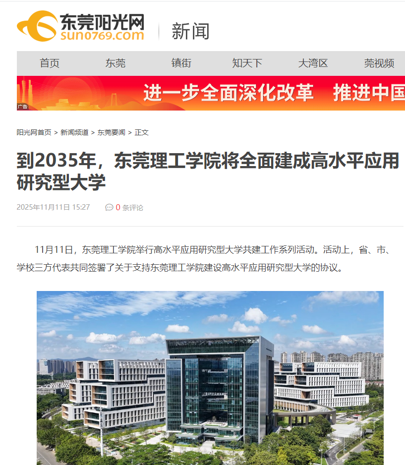 根据协议,东莞理工学院将以深化教育综合改革为根本动力,统筹推进育人方式深度变革、科研范式数字化转型、办学模式开放协同创新、治理体系现代化能力提升,全面畅通教育链、创新链、人才链的有机融合。通过强化需求牵引的学科动态调整机制、构建产教融合的协同育人体系、完善有组织科研的制度保障,加快形成“扎根湾区、面向产业、融通中外、引领发展”的地方应用型高校高质量发展范式。到2035年,将全面建成高水平应用研究型大学。