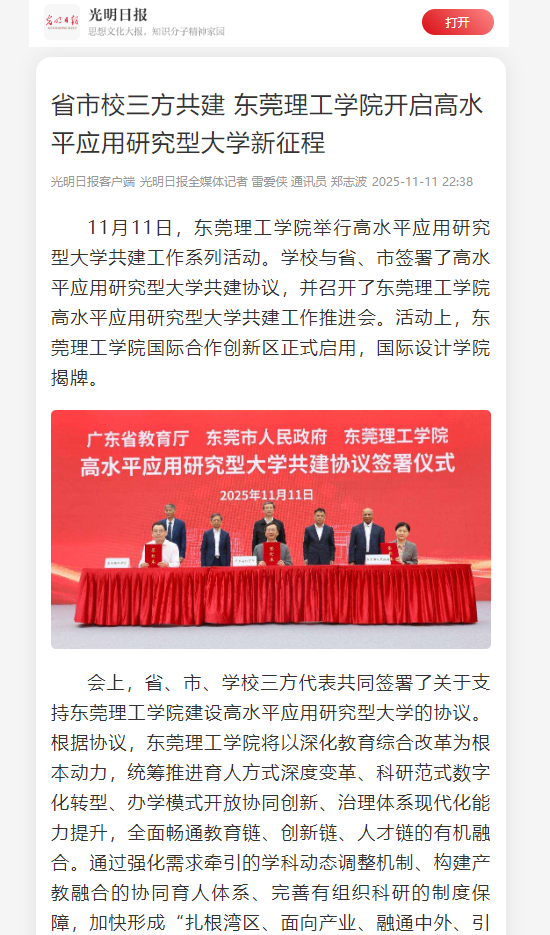 会上,省、市、学校三方代表共同签署了关于支持东莞理工学院建设高水平应用研究型大学的协议。根据协议,东莞理工学院将以深化教育综合改革为根本动力,统筹推进育人方式深度变革、科研范式数字化转型、办学模式开放协同创新、治理体系现代化能力提升,全面畅通教育链、创新链、人才链的有机融合。通过强化需求牵引的学科动态调整机制、构建产教融合的协同育人体系、完善有组织科研的制度保障,加快形成“扎根湾区、面向产业、融通中外、引领发展”的地方应用型高校高质量发展范式。到2035年,将全面建成高水平应用研究型大学。