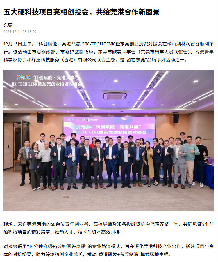 12月13日上午,“科创赋能,莞港共赢”HK-TECH LINK暨东莞创业投资对接会在松山湖林润智谷顺利举行。该活动由市委组织部、市委统战部指导,东莞市欧美同学会(东莞市留学人员联谊会)、香港青年科学家协会和绿丞科技服务(香港)有限公司联合主办,是“留在东莞”品牌系列活动之一。