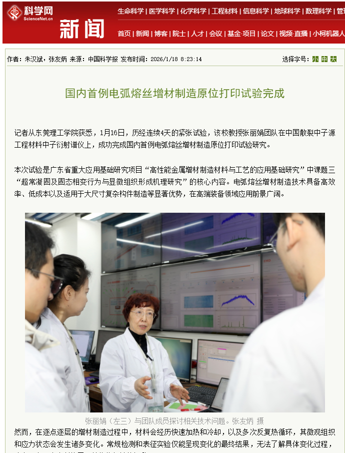 记者从东莞理工学院获悉,1月16日,历经连续4天的紧张试验,该校教授张丽娟团队在中国散裂中子源工程材料中子衍射谱仪上,成功完成国内首例电弧熔丝增材制造原位打印试验研究。