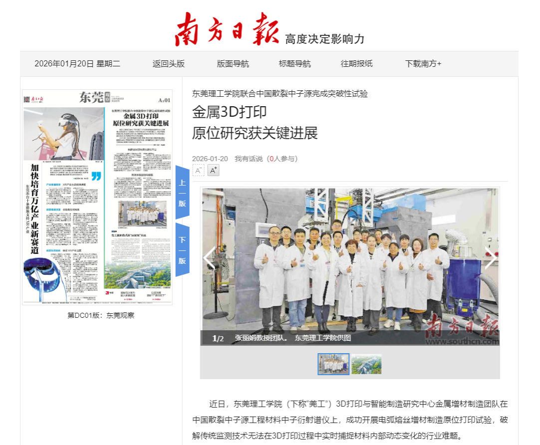 近日,东莞理工学院(下称“莞工”)3D打印与智能制造研究中心金属增材制造团队在中国散裂中子源工程材料中子衍射谱仪上,成功开展电弧熔丝增材制造原位打印试验,破解传统监测技术无法在3D打印过程中实时捕捉材料内部动态变化的行业难题。