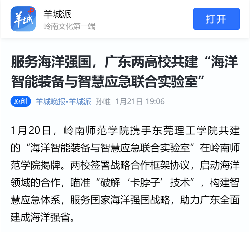 1月20日,岭南师范学院携手东莞理工学院共建的“海洋智能装备与智慧应急联合实验室”在岭南师范学院揭牌。两校签署战略合作框架协议,启动海洋领域的合作,瞄准“破解‘卡脖子’技术”,构建智慧应急体系,服务国家海洋强国战略,助力广东全面建成海洋强省。