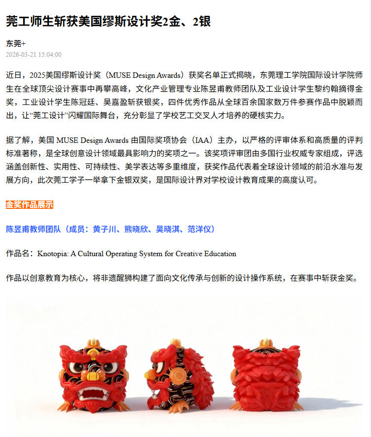 近日,2025美国缪斯设计奖(MUSE Design Awards)获奖名单正式揭晓,东莞理工学院国际设计学院师生在全球顶尖设计赛事中再攀高峰,文化产业管理专业陈昱甫教师团队及工业设计学生黎约翰摘得金奖,工业设计学生陈冠廷、吴嘉盈斩获银奖,四件优秀作品从全球百余国家数万件参赛作品中脱颖而出,让“莞工设计”闪耀国际舞台,充分彰显了学校艺工交叉人才培养的硬核实力。