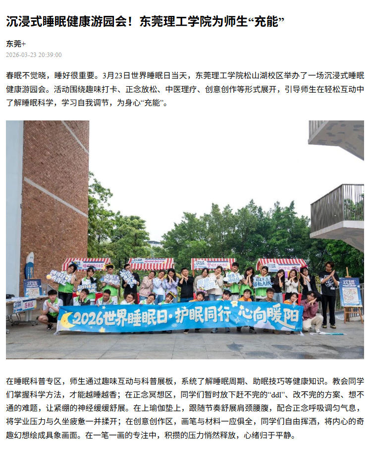 春眠不觉晓,睡好很重要。3月23日世界睡眠日当天,东莞理工学院松山湖校区举办了一场沉浸式睡眠健康游园会。活动围绕趣味打卡、正念放松、中医理疗、创意创作等形式展开,引导师生在轻松互动中了解睡眠科学,学习自我调节,为身心“充能”。
