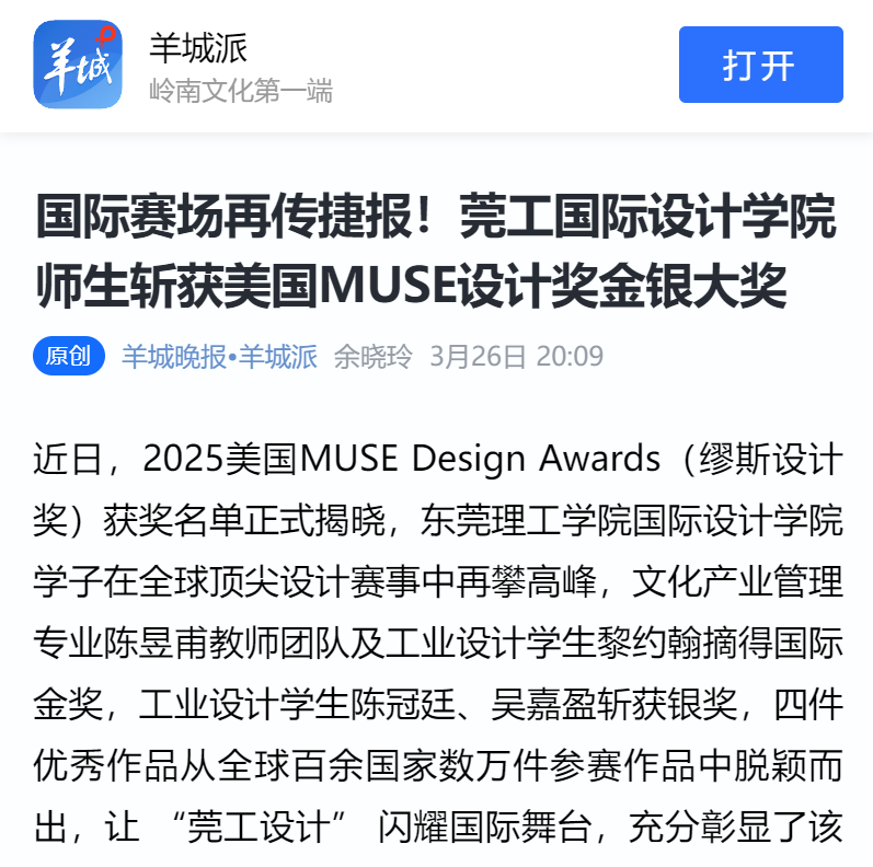 近日,2025美国MUSE Design Awards(缪斯设计奖)获奖名单正式揭晓,东莞理工学院国际设计学院学子在全球顶尖设计赛事中再攀高峰,文化产业管理专业陈昱甫教师团队及工业设计学生黎约翰摘得国际金奖,工业设计学生陈冠廷、吴嘉盈斩获银奖,四件优秀作品从全球百余国家数万件参赛作品中脱颖而出,让 “莞工设计” 闪耀国际舞台,充分彰显了该校艺工交叉人才培养的硬核实力。