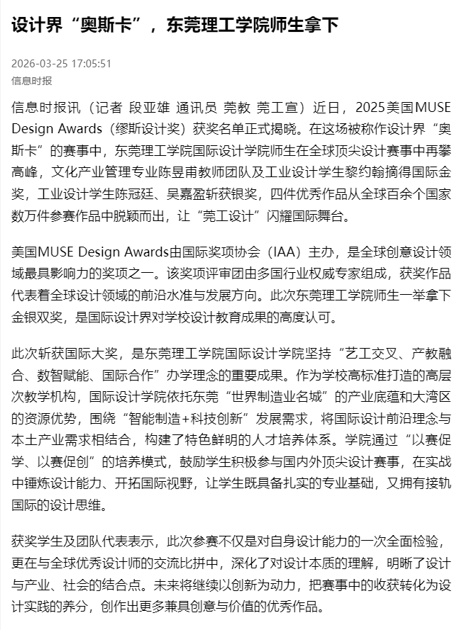近日,2025美国MUSE Design Awards(缪斯设计奖)获奖名单正式揭晓。在这场被称作设计界“奥斯卡”的赛事中,东莞理工学院国际设计学院师生在全球顶尖设计赛事中再攀高峰,文化产业管理专业陈昱甫教师团队及工业设计学生黎约翰摘得国际金奖,工业设计学生陈冠廷、吴嘉盈斩获银奖,四件优秀作品从全球百余个国家数万件参赛作品中脱颖而出,让“莞工设计”闪耀国际舞台。